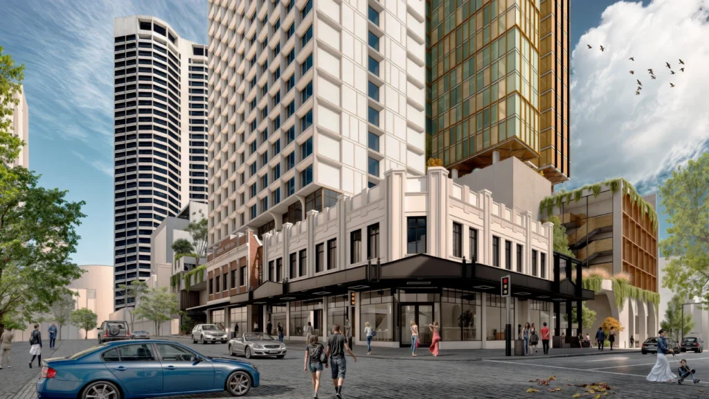 Whilst the proposal makes use of the City’s preferred podium and tower development model, it recognises the need to be respectful to the existing site conditions. The development responds sympathetically to the challenge in balancing a separation between the heritage buildings with the desire to offer a continuation of the urban fabric in the immediate vicinity. The retention, rejuvenation and addition to the heritage listed Pearl Villa and hostel, constructed in 1887, with an undertaking of extensive conservation works will enable the adaptive reuse of the buildings.