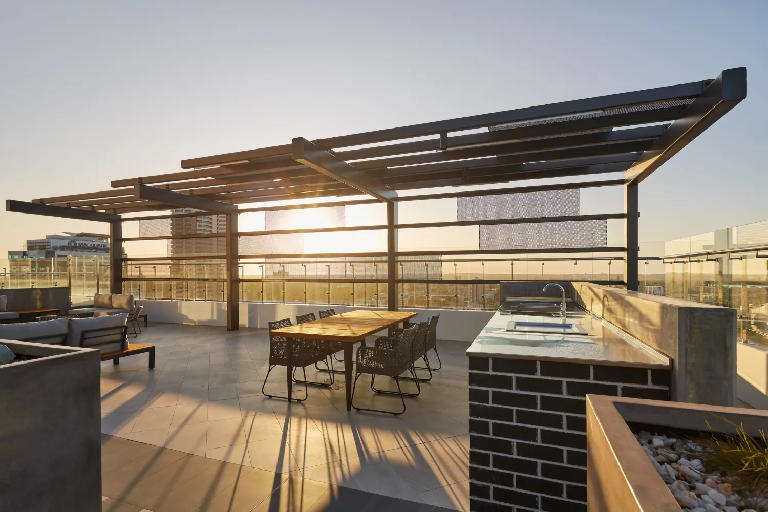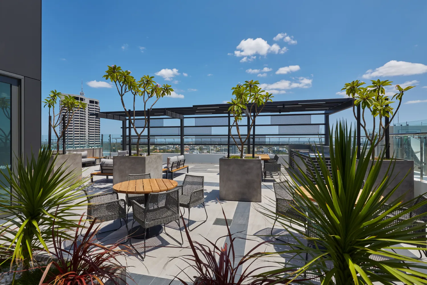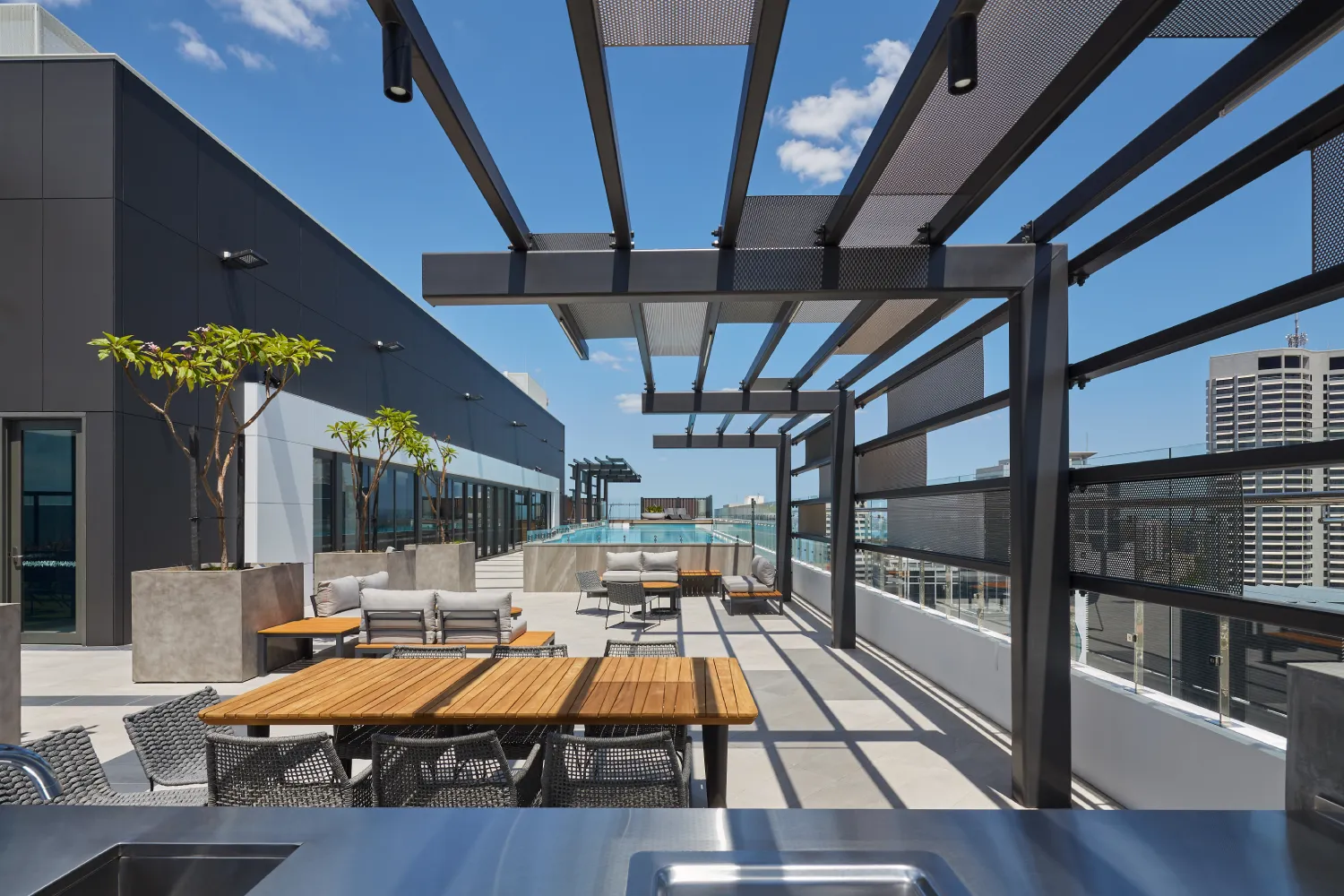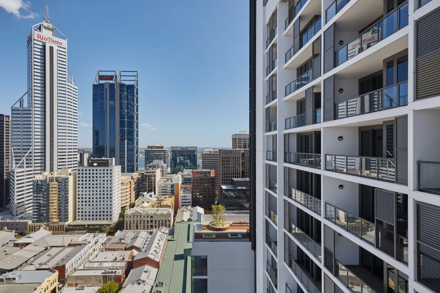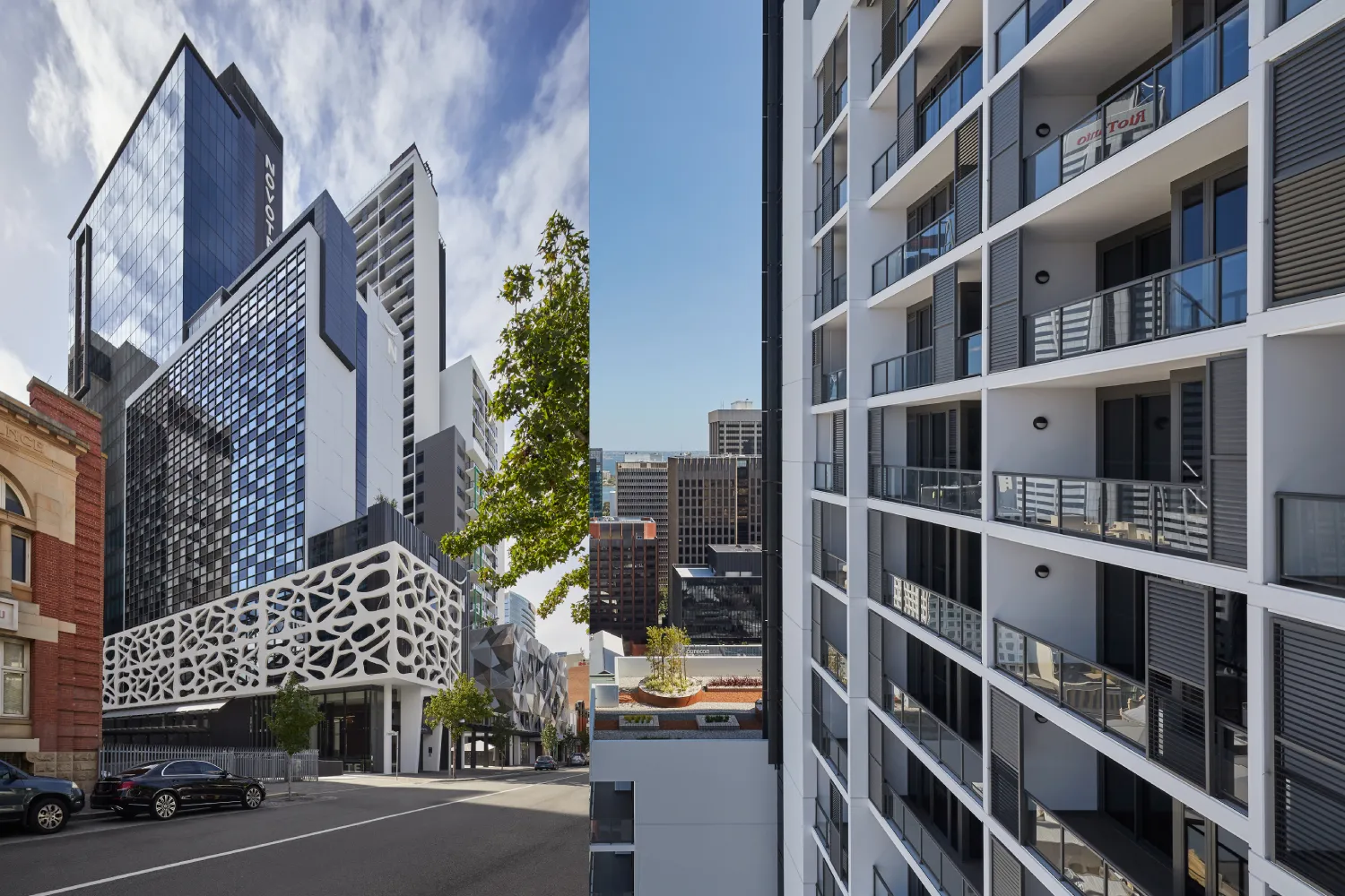 These solid surfaces allow for prominent up-lighting of the buildings, creating a dramatic addition to the Perth skyline. The tiered massing of both towers also forms a variety of green terraces that capture views across the surrounding cityscape, the Swan River and beyond.