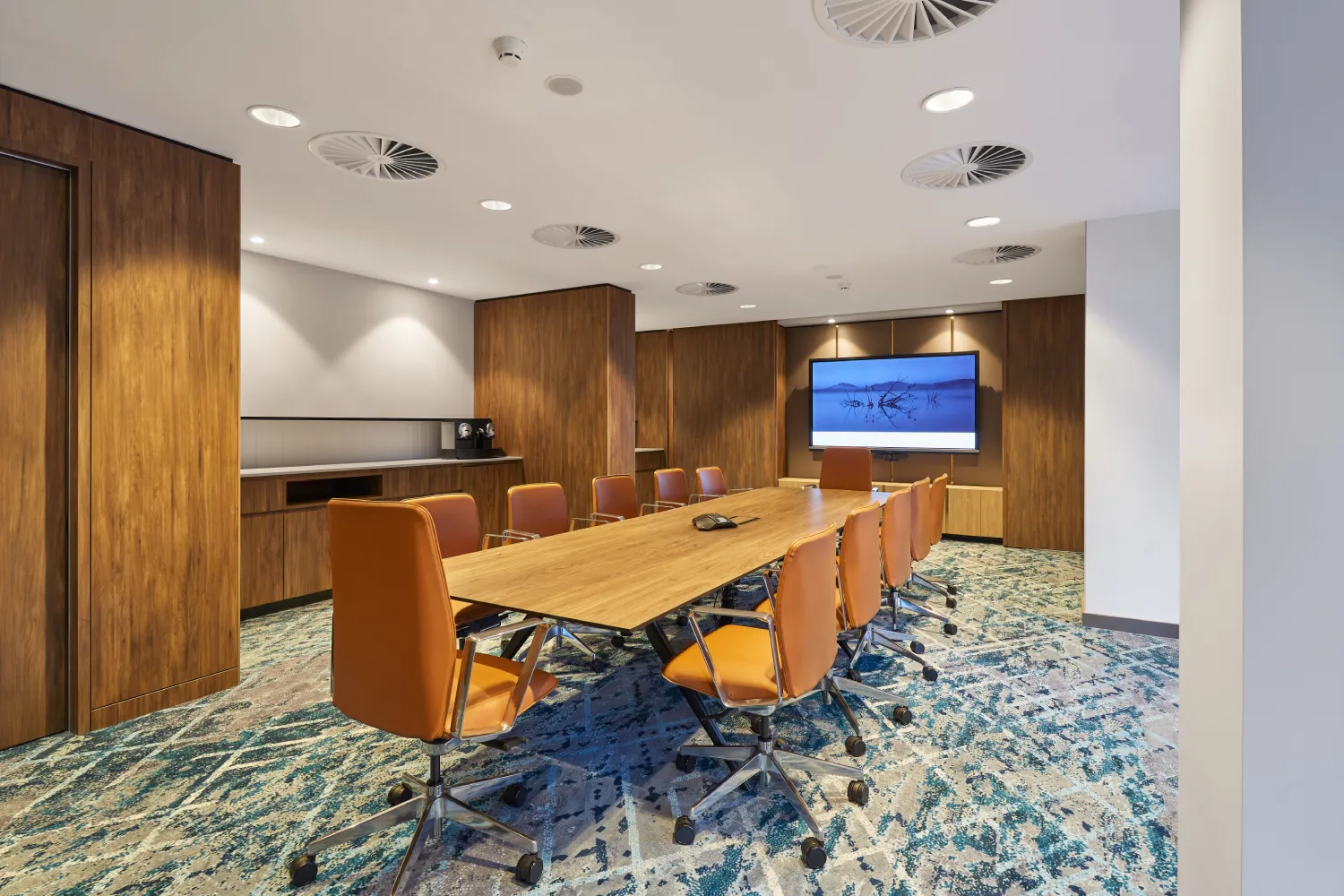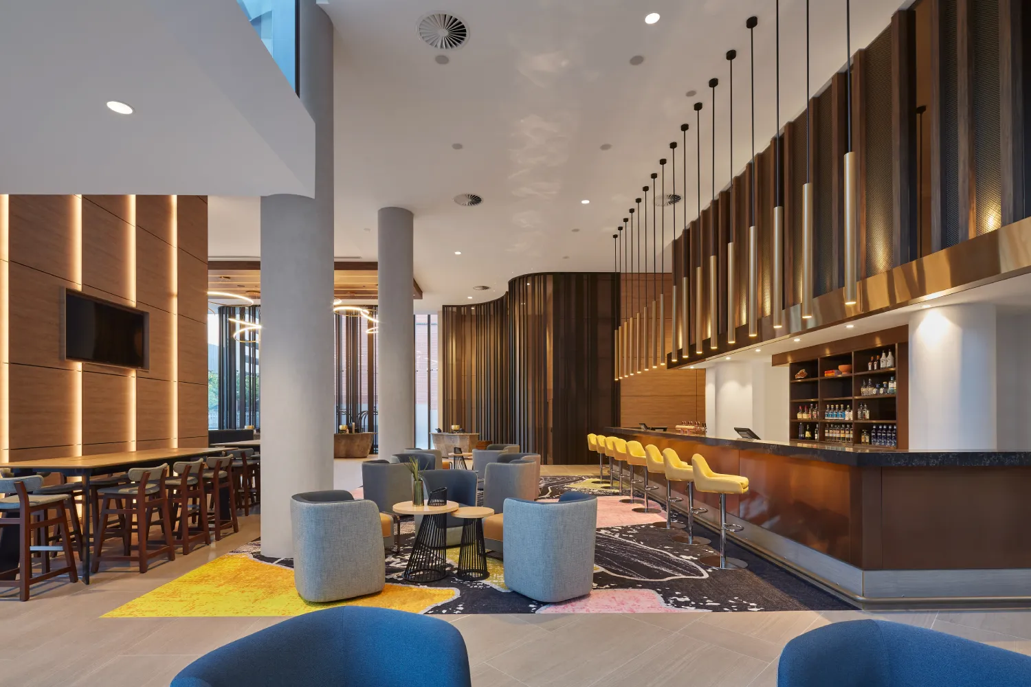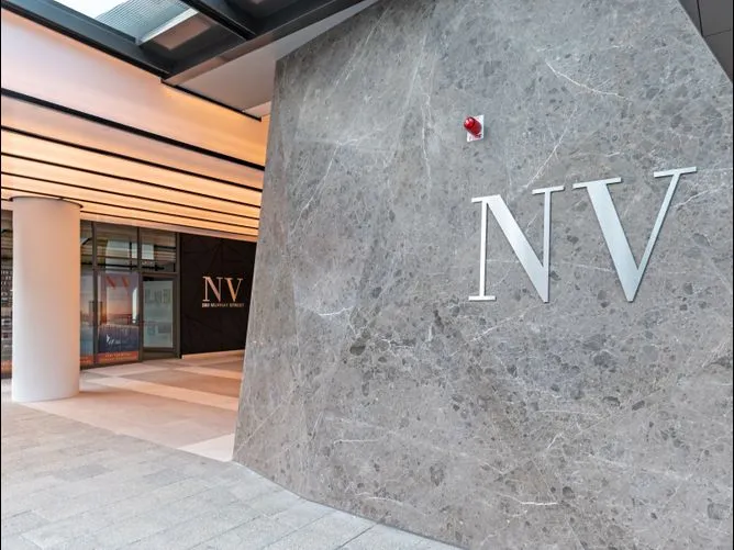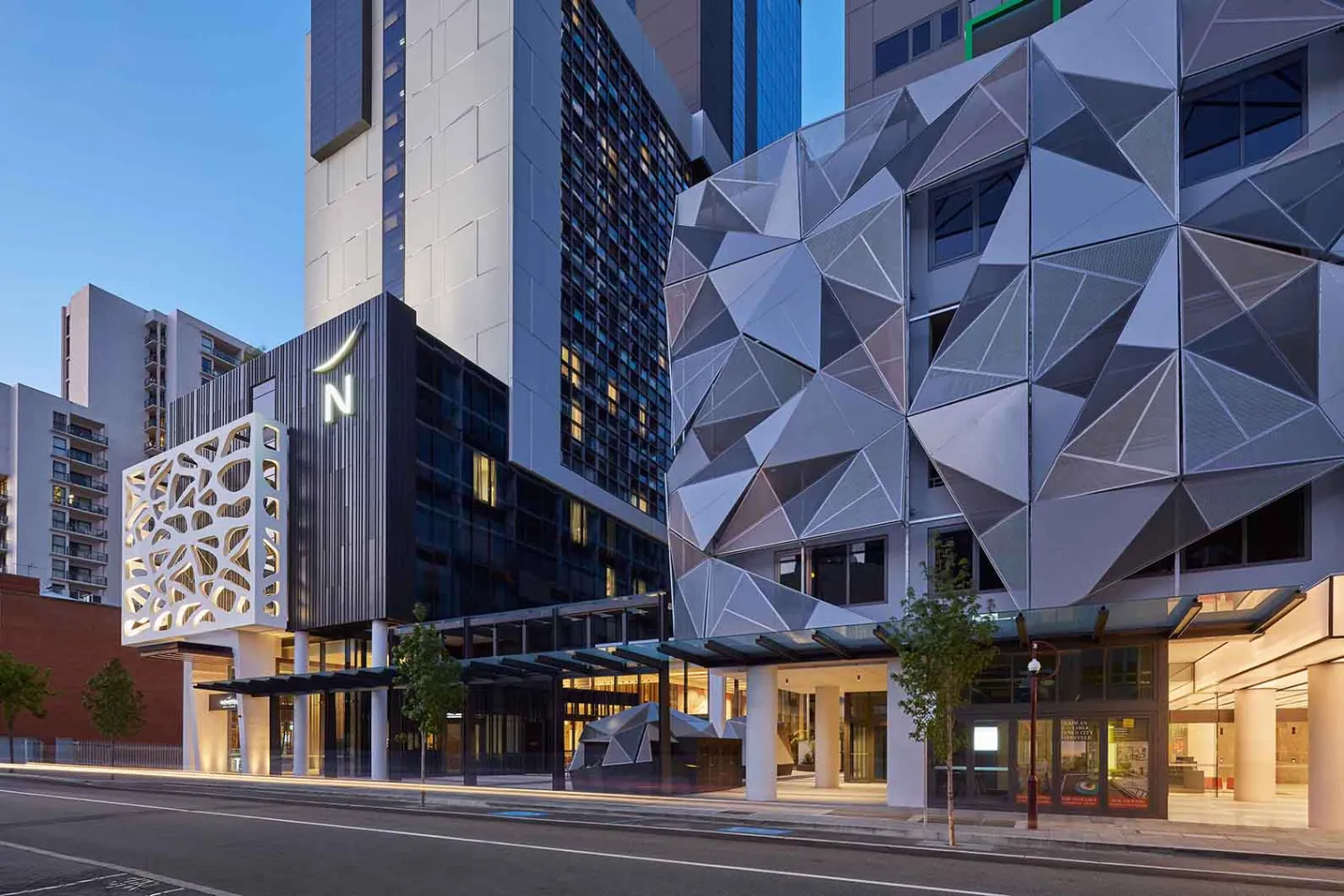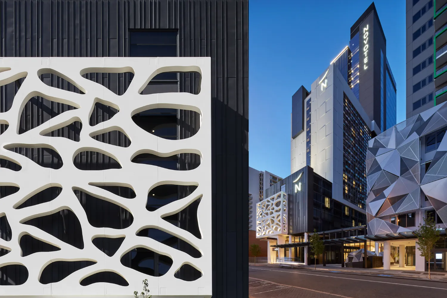 The hotel tower is presented as a flush, glazed, elegant rectangular form in contrast to the more textured NV Apartment tower. The base of the NV Apartment tower is wrapped in a vibrant suspended mesh façade, adding visual interest and a welcoming identity. This dynamic three-dimensional envelope complements the subtle detailing of the active streetscape below.