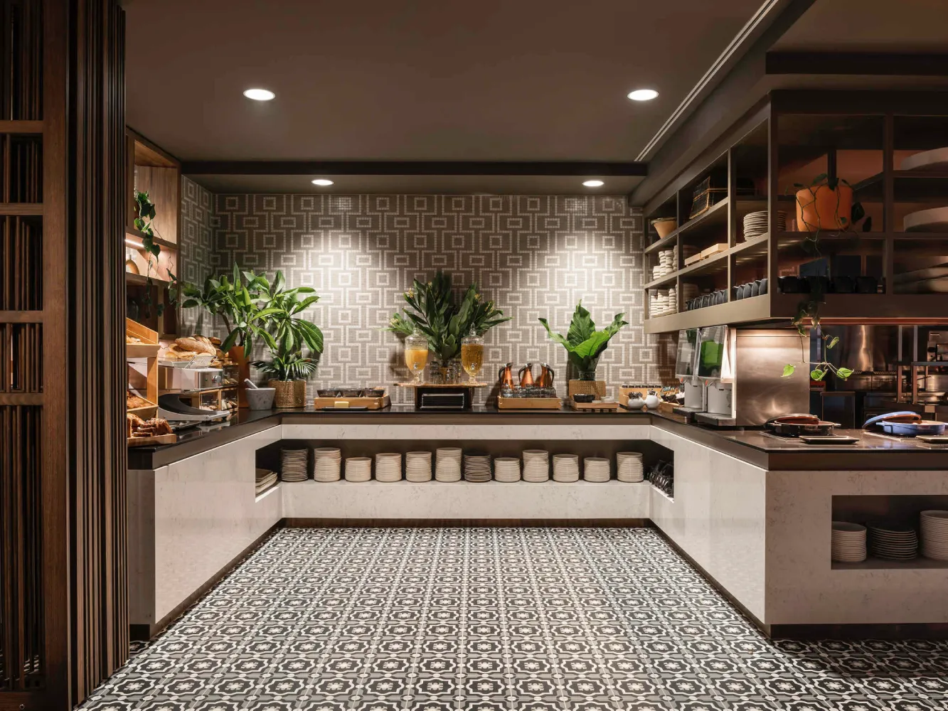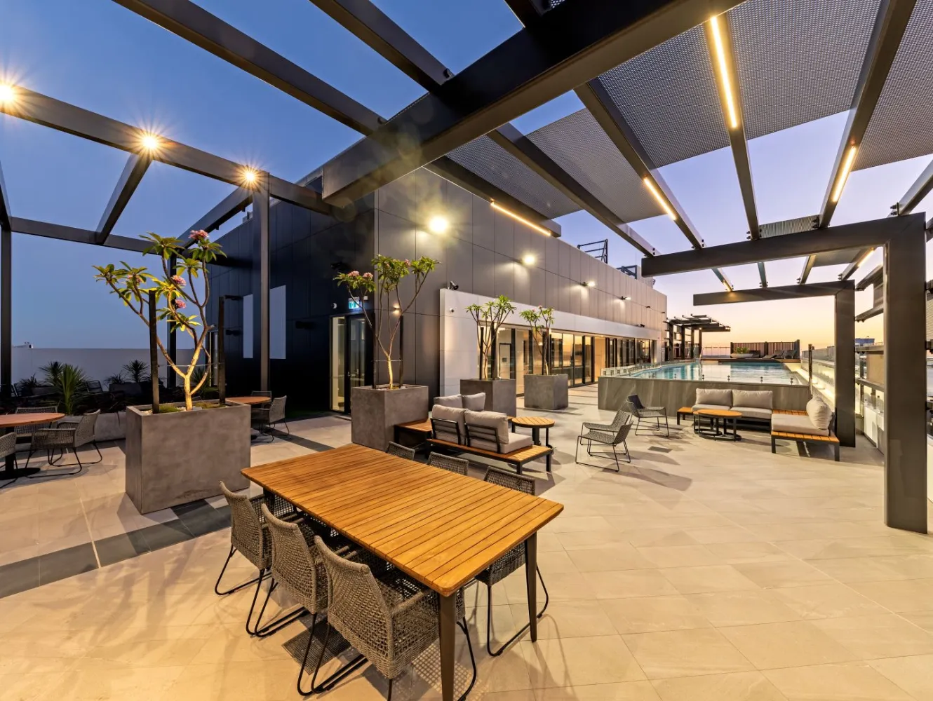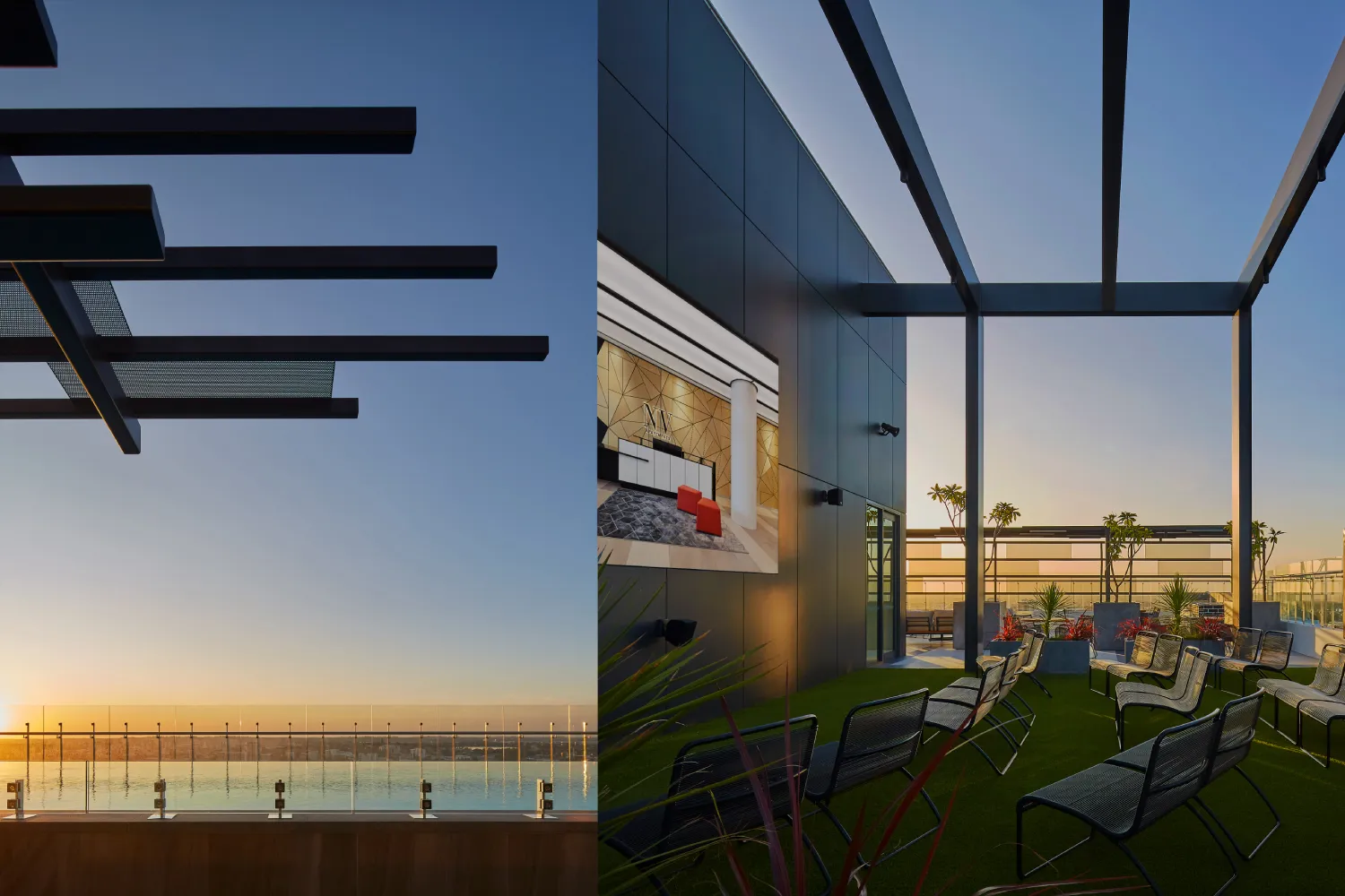 Each tower includes a range of guest and resident amenities including a fully equipped gym, swimming pool, sauna, spa, sun deck and barbeque facilities, with hospitality and commercial tenancies at ground level.