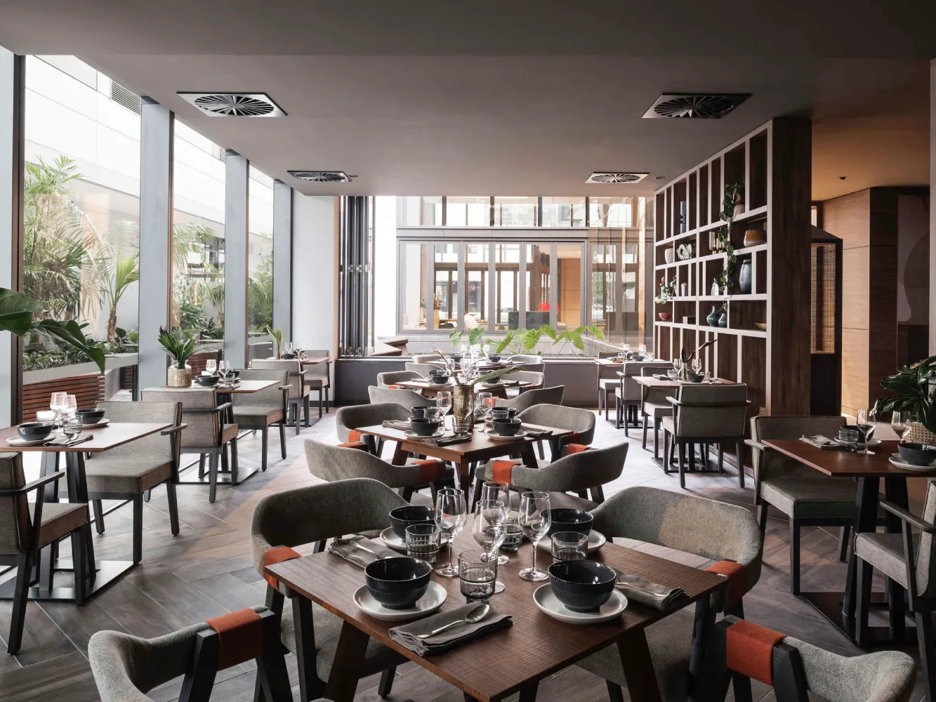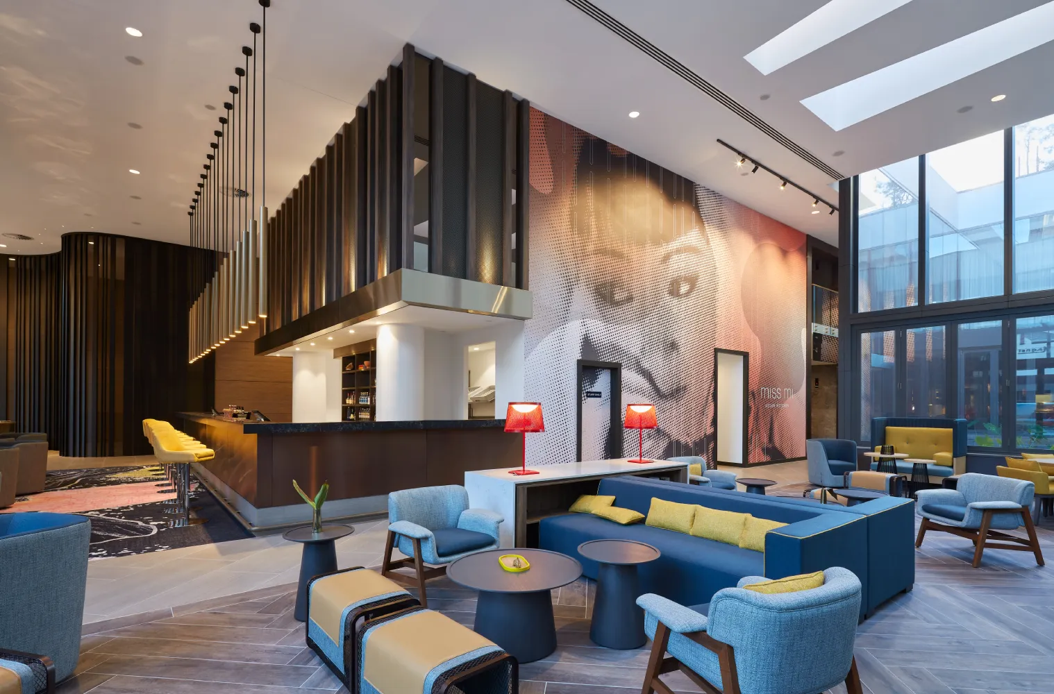 Both the residential and hotel buildings share a lower podium that continues the streetscape, with the upper floors set back to give the impression that the towers float above. The stepping back of both towers results in a slender vertical form that highlights the architectural massing.