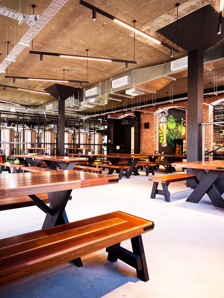 Located near the West Perth train station,The Phat Brew Club Brewery is a refurbished design project that transformed a historic red brick office building (Hay Market) into a vibrant brewery. The design features a restaurant, bar, brewery tank display area, microbrewery, and an alfresco space. Guests can enjoy beer supplied directly from the adjacent bright tanks, creating a fresh and immersive experience.