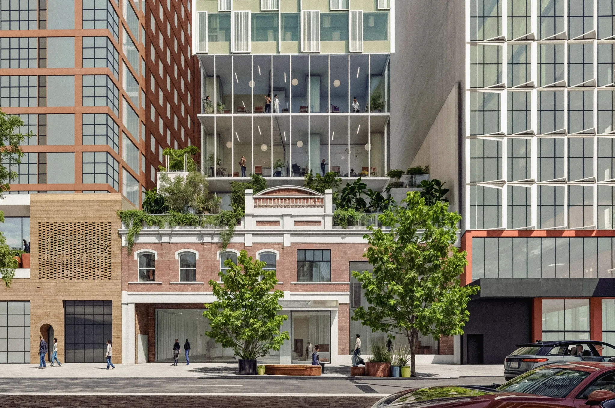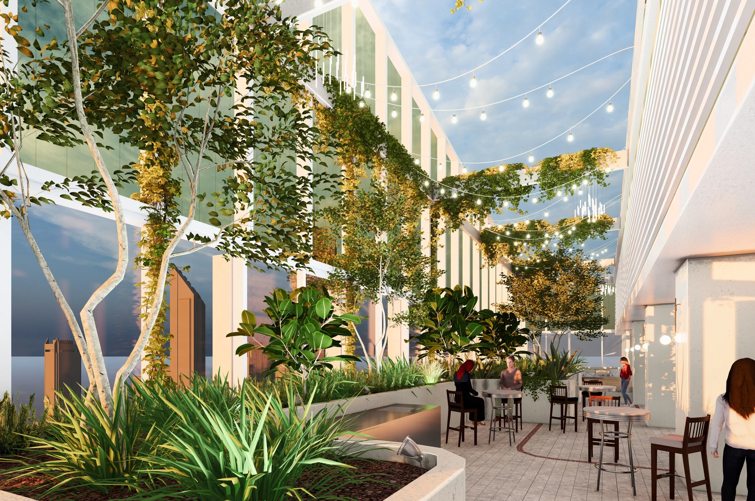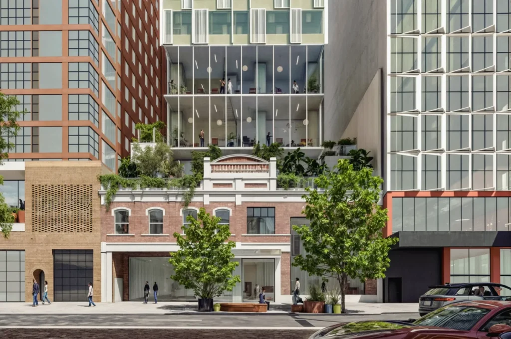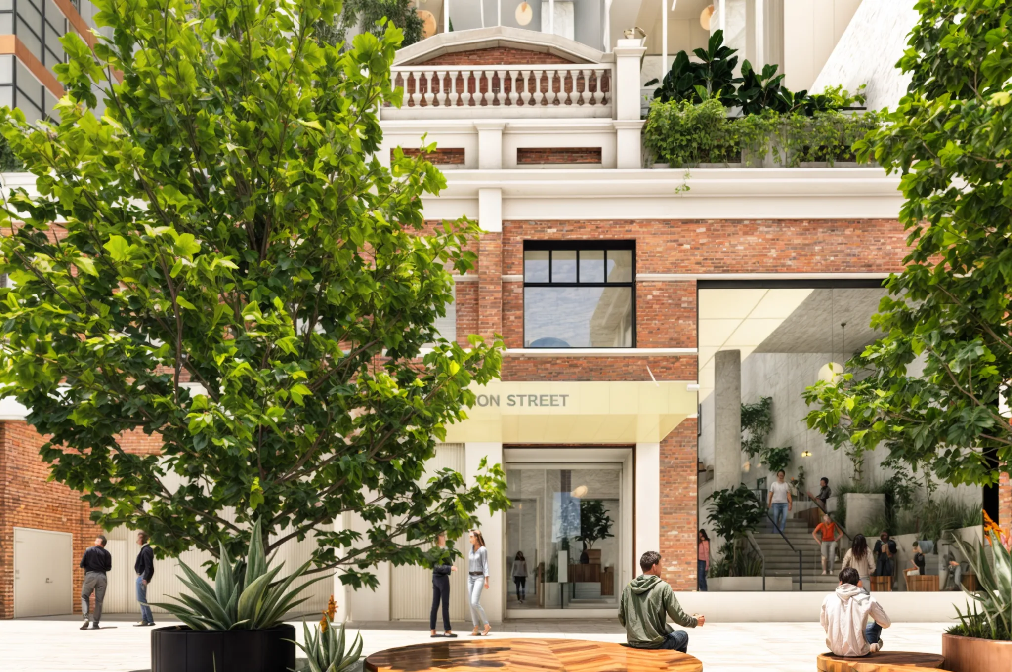 A welcoming entry experience sets the tone, complemented by an activated lobby that offers alfresco amenities and intimate gathering spaces for residents and visitors. Thoughtfully integrated seating, raised planters with lush greenery, and strategically placed tree planting contribute to a dynamic and engaging environment at entry level and throughout the building.