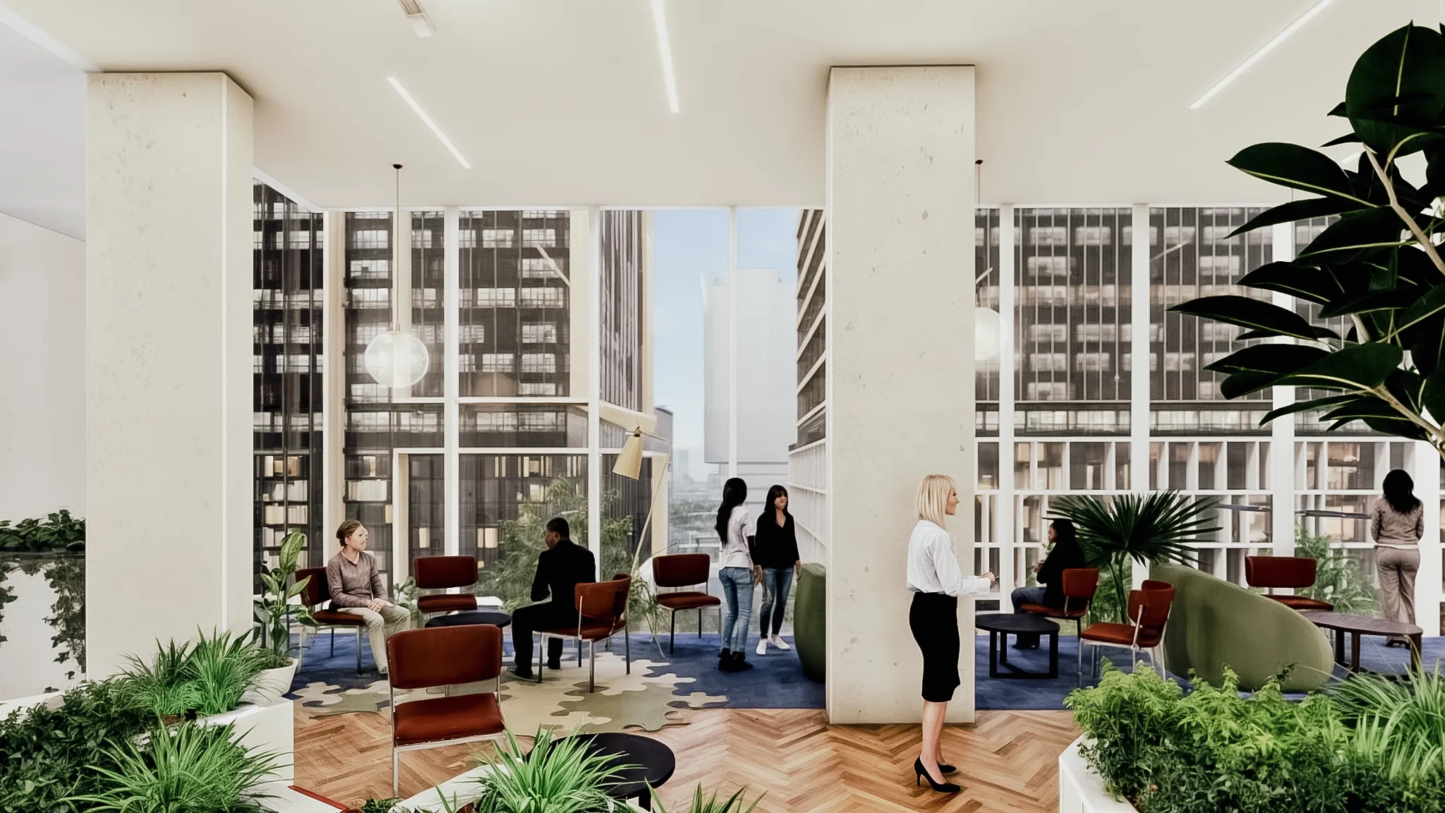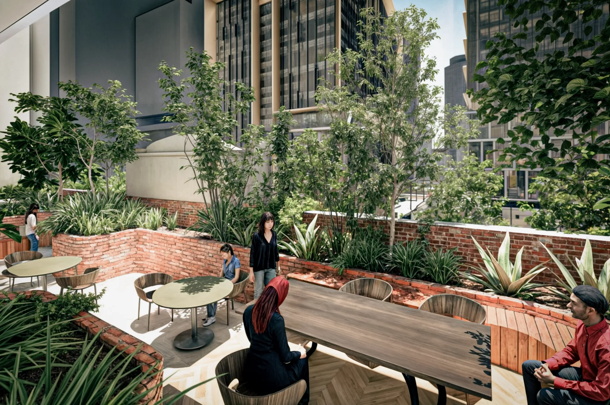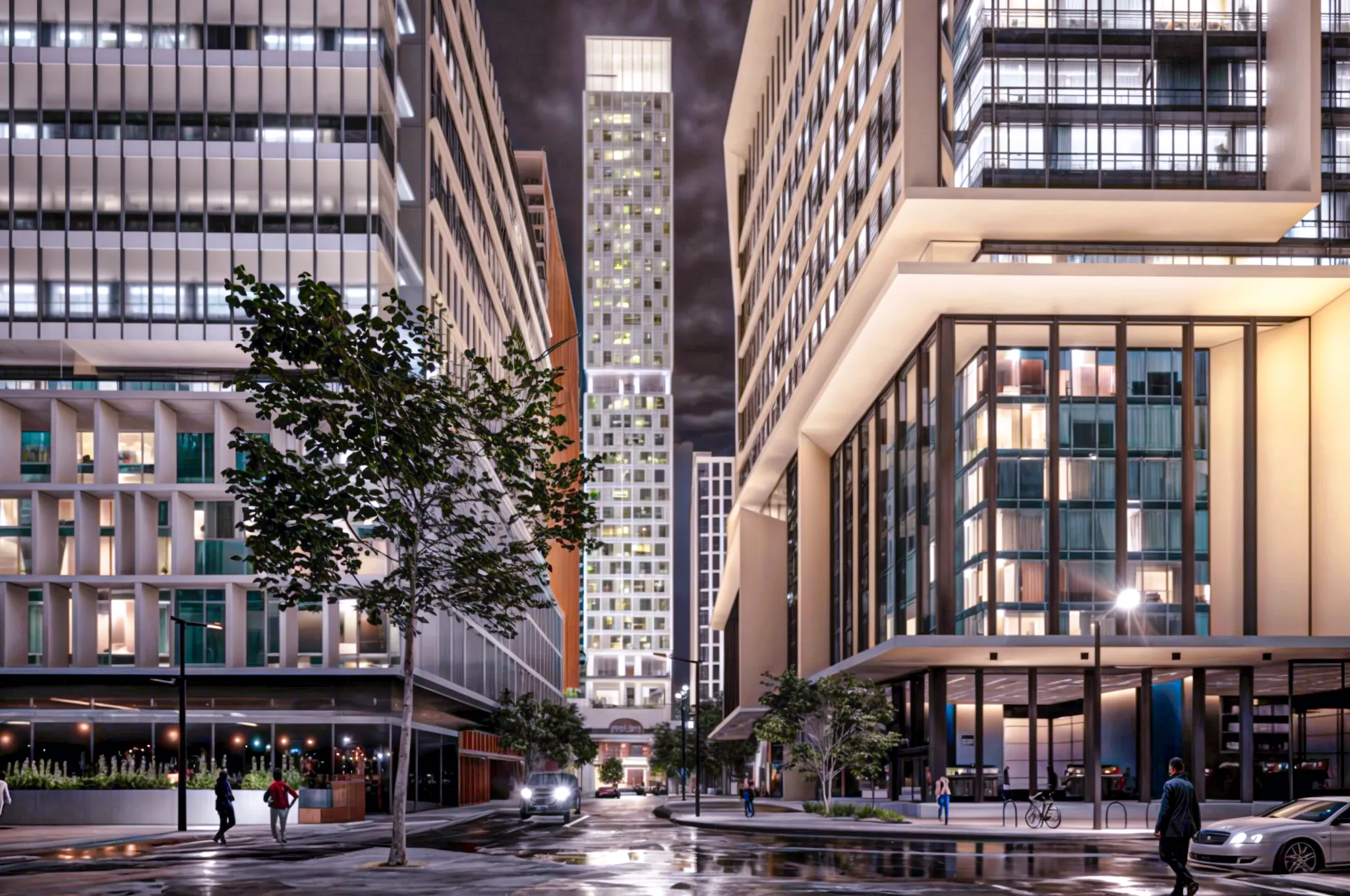 A welcoming entry experience sets the tone, complemented by an activated lobby that offers alfresco amenities and intimate gathering spaces for residents and visitors. Thoughtfully integrated seating, raised planters with lush greenery, and strategically placed tree planting contribute to a dynamic and engaging environment at entry level and throughout the building.